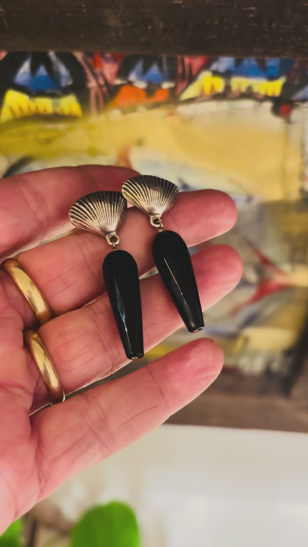 Clean lines in faceted Black Onyx pair beautifully with the natural Shell shape in this classic Post earring. Lead free pewter and Black onyx faceted teardrop. Measure 2”, medium weight and wear comfortably.